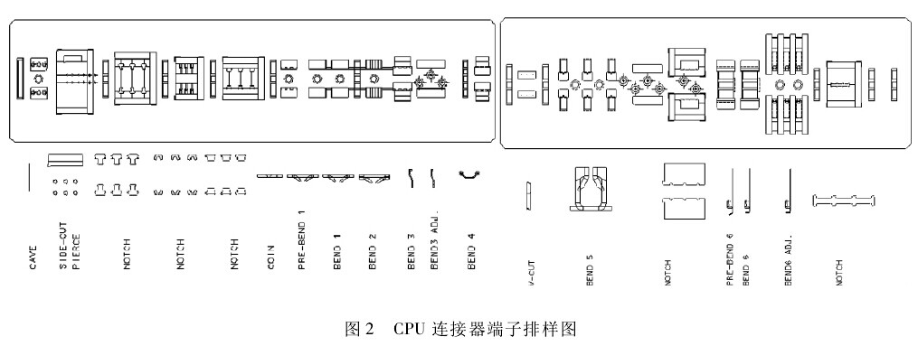 根據(jù)后續(xù)電鍍及裝配的需要,端子沖壓產(chǎn)品設(shè)計(jì)時(shí)己經(jīng)規(guī)定了送料步距、載體形式以及導(dǎo)正定位針的大小、位置等。工位設(shè)計(jì)時(shí)考慮此端子部分關(guān)鍵區(qū)域(如“R”形頭部)不允許有沖裁毛刺,設(shè)置有倒角去毛刺工站(COIN )。根據(jù)前述分析,CPU連接器端子沖壓排樣圖如圖2所示。